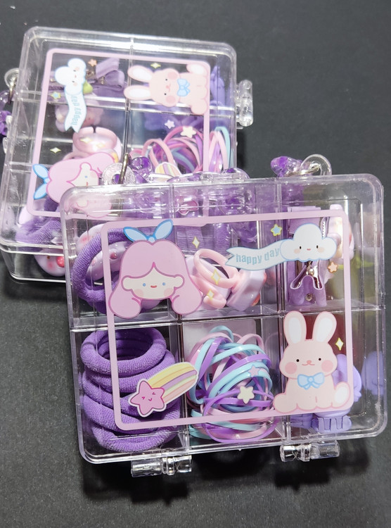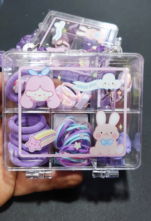 این محصول جذاب دخترانه دارای 6 قسمت هست که تو هر قسمت این اجناس رو داره .1 کش موی سر ساده . 2 کش سر فانتزی. 3 انگشتر. 4 کلیپس انبری فانتزی. 5 کش سر 40 گیس بزرگ . 6 کلیپس کوچک فانتزی