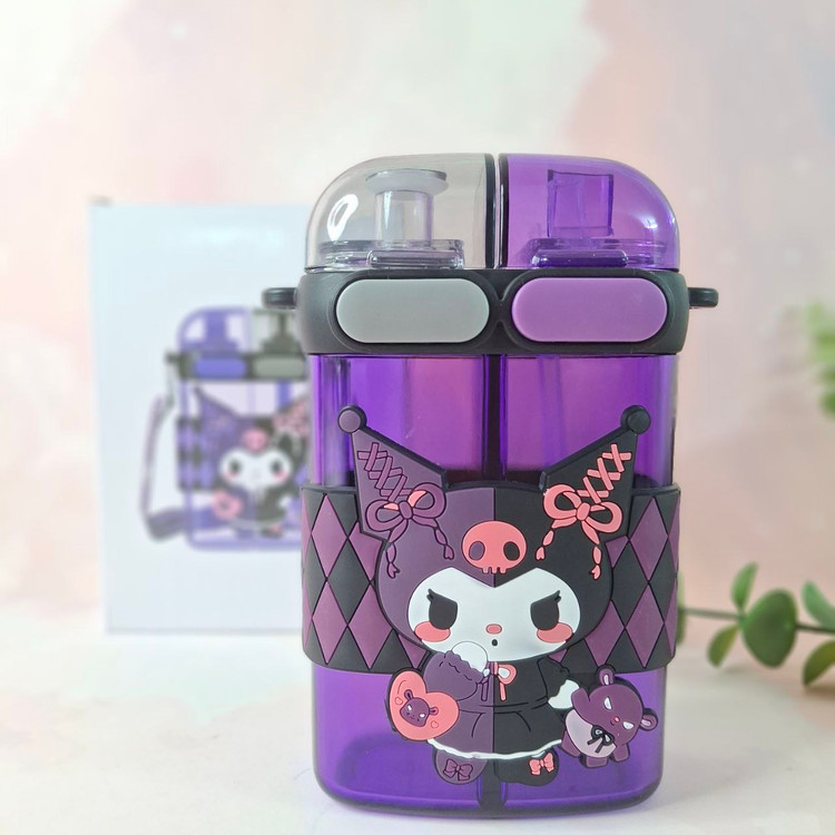 قمقمه دو مخزن کرومی (Kuromi)، یک قمقمه فانتزی با دو محفظه مجزا برای دو نوع نوشیدنی متفاوت (مثلاً آب و آبمیوه)، جنس اکریلیک نشکن، ضد نشت، دارای دربهای جداگانه با سریهای نیدار و آسان نوش، همراه با بند و طرح شخصیت محبوب کرومی است که برای کودکان و نوجوانان جذاب است