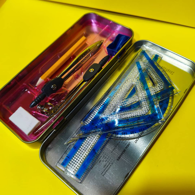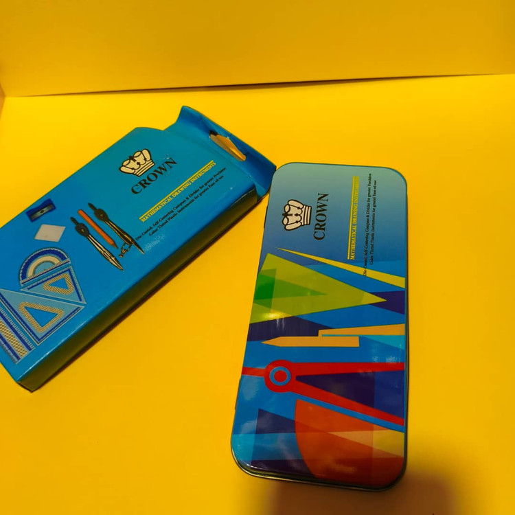 ست پرگار 9 تکه جعبه فلزی CROWN شامل دو عدد گونیای بزرگ و کوچک ، 1 عدد نقاله ،1 عدد خط کش 15 سانتی متری، 2 عدد پرگار، 1 عدد پاک کن، 1 عدد تراش و مداد مورد استفاده برای پرگار می باشد.