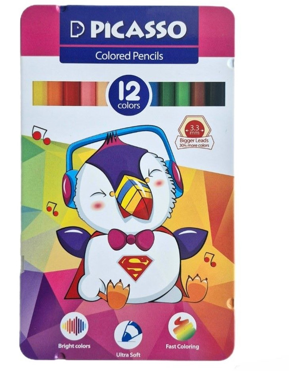 مدادرنگی ۱۲ رنگ جعبه فلزی پیکاسو، طرح پرنده، از محصولات برند محبوب پیکاسو می باشد. این برند اخیرا به دلیل کیفیت بالا و قیمت مناسب محصولاتش بسیار محبوبیت یافته است. این محصول دارای یک جعبه مستطیلی فلزی محکم است. بدنه این مدادها ۶ ضلعی بوده و دارای مغزی نرم با پیگمنت بالا می باشد.